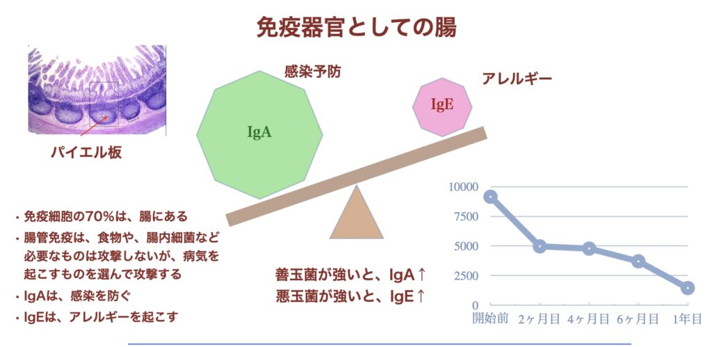 ここで重要なのがIgA抗体。これは腸の粘膜表面で病原体を防ぐ「見張り役」です。腸内細菌のバランスが整っているとIgAが増え、感染症やアレルギーの予防につながります。逆に悪玉菌が優位になるとIgEが増え、アレルギーや炎症が起こりやすくなります。