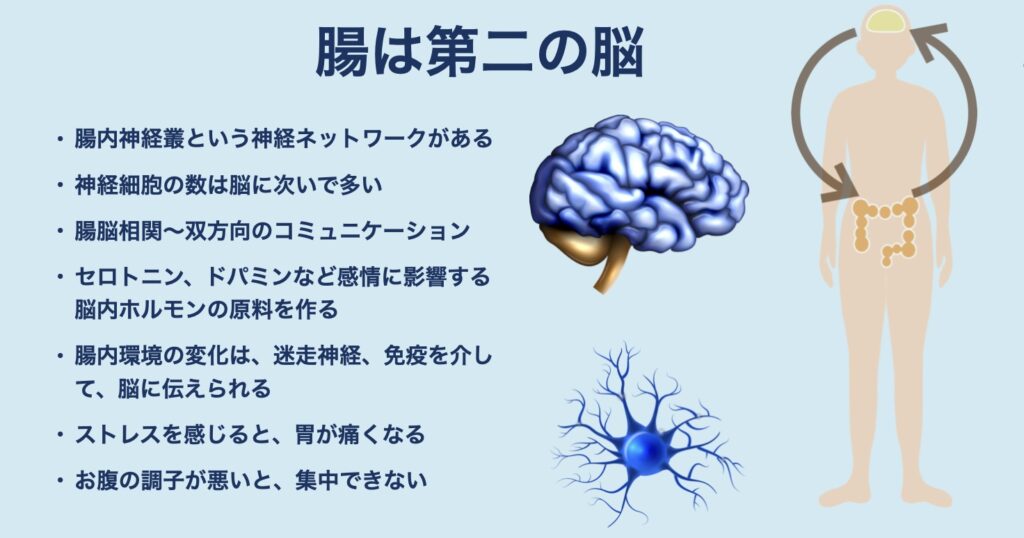 腸は「第二の脳」と呼ばれるほど神経ネットワークが発達しており、脊髄よりも多くの神経細胞が存在します。腸と脳は迷走神経などを通じて情報交換をしており、これを「腸脳相関」といいます。