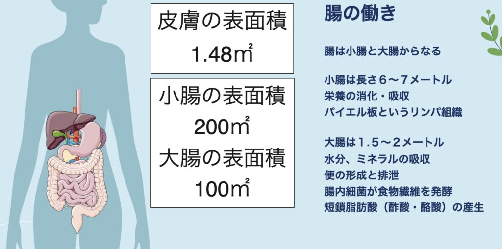 小腸は長さ6〜7m、表面積は200㎡もあり、食べ物を分解し、栄養を吸収するのが主な役割です。炭水化物はブドウ糖、タンパク質はアミノ酸、脂肪は脂肪酸にまで分解され、体に取り込まれます。さらに小腸の粘膜には「パイエル板」と呼ばれるリンパ組織が集まり、免疫を担っています。