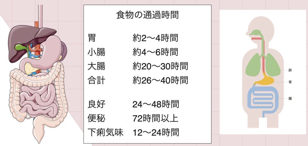 食べたものが口から入って便として出るまでの時間は、一般的に24~48時間ほどです。