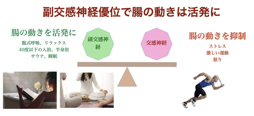 逆に、副交感神経が優位になると腸の蠕動運動(ぜんどううんどう)が活発になります。