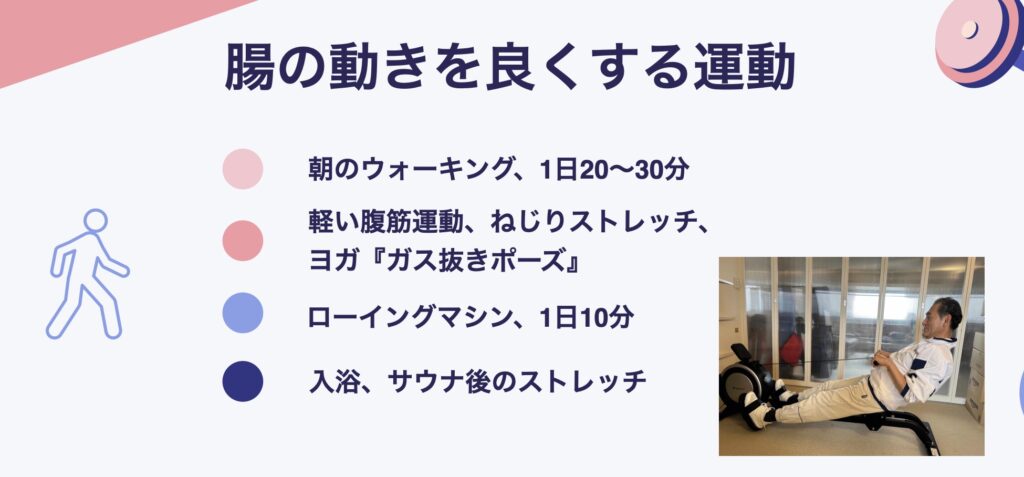 これらの動作は、腹筋や体幹の筋肉を活性化し、腸を自然にマッサージしてくれます。