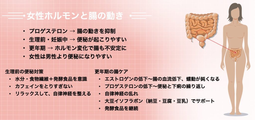 プロゲステロンが優位になる時期には腸の動きが鈍くなり、便秘が起こりやすくなります。